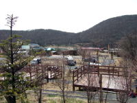 奥に見えるのが管理棟から見た電源Aサイト。手前の桟敷にもテントが設営できるようですね。 |