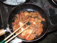 | きりん君でポークビーンズの最後の仕上げ。同時にシーフードグラタンも焼き上げます。 |