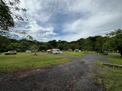 サイトはかなり広めです。 地面は砂利。石が多めです。 砂利敷きなので水捌けは良さそうです。